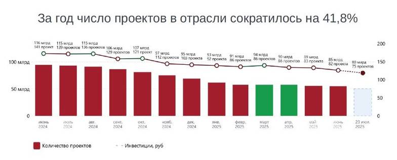 С июня 2024 года по июнь 2025 года объем заявленных инвестиций в проекты в легкой промышленности, связанные со строительством или модернизацией, снизился на 26,7% — со 116 млрд рублей до 80 млрд рублей; а количество проектов в активной стадии реализации сократилось на 41,8% — со 141 до 75. К такому выводу пришли аналитики цифровой платформы «Инвестиционные проекты».