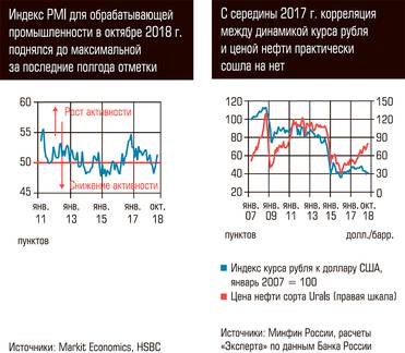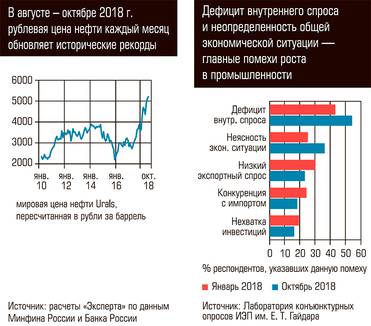 Оперативные данные октябрьских опросов промышленных предприятий ИЭП им. Е. Т. Гайдара зафиксировали восстановление после летнего провала и сентябрьской заминки. В условиях замедления роста выпуска это привело к недостатку запасов готовой продукции и росту оптимизма производственных планов. Дефицит мощностей регистрируется в 2018 году только у 7–9% предприятий, тогда как избыток машин и оборудования «в связи с ожидаемыми изменениями спроса» имеют 19–20% предприятий. «Баланс получается положительным — промышленность имеет навес избыточных мощностей», — резюмирует Сергей Цухло, заведующий лабораторией конъюнктурных опросов ИЭП.