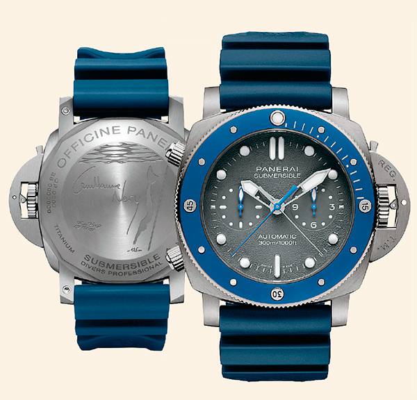 Новая модель от Panerai посвящена французскому спортсмену Гийому Нери — чемпиону мира по фридайвингу. Panerai Submersible Chrono — Guillaume Néry edition — это профессиональные часы для дайверов: они способны сохранять водонепроницаемость на глубине до 300 метров (30 бар) и оснащены однонаправленно вращающимся безелем, который точно указывает продолжительность погружения. Показания циферблата отлично считываются при любом освещении и даже в полной темноте. Задняя крышка украшена гравировками с автографом чемпиона и показателем его последнего ошеломительного рекорда погружения — 126 метров, которые спортсмен преодолел на одном дыхании. Титановый корпус этих легких привлекательных часов прекрасно гармонирует с синим цветом керамического диска на безеле, синими стрелками и синим ремешком из каучука. Кроме того, высокоточный хронограф с функцией flyback и системой установки секундной стрелки на ноль обеспечивает превосходную синхронизацию показаний часов с сигналом точного времени. Часы Panerai Submersible Chrono — Guillaume Néry edition оснащены автоматическим калибром P.9100 с трехдневным запасом хода.