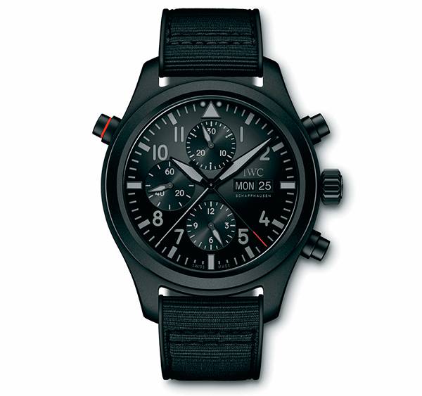 Модель Pilot’s Watch Double Chronograph Top Gun Ceratanium — первые часы для пилотов от марки IWC из материала Ceratanium: корпус из этого материала, черный циферблат, черные стрелки, черный каучуковый ремешок. Ceratanium, разработанный компанией IWC, сочетает в себе лучшие характеристики титана и керамики, которые в новом соединении образовали революционный сплав. Запатентованный материал обладает малым весом и высокой прочностью, что характерно для титана, но в то же время он тверд и устойчив к царапинам, как керамика. Материал очень приятен на ощупь, обладает высокими антикоррозийными свойствами и отличается черным матовым цветом. Такой цвет защищает глаза пилота от солнечного света, который могут отражать обычные часы.