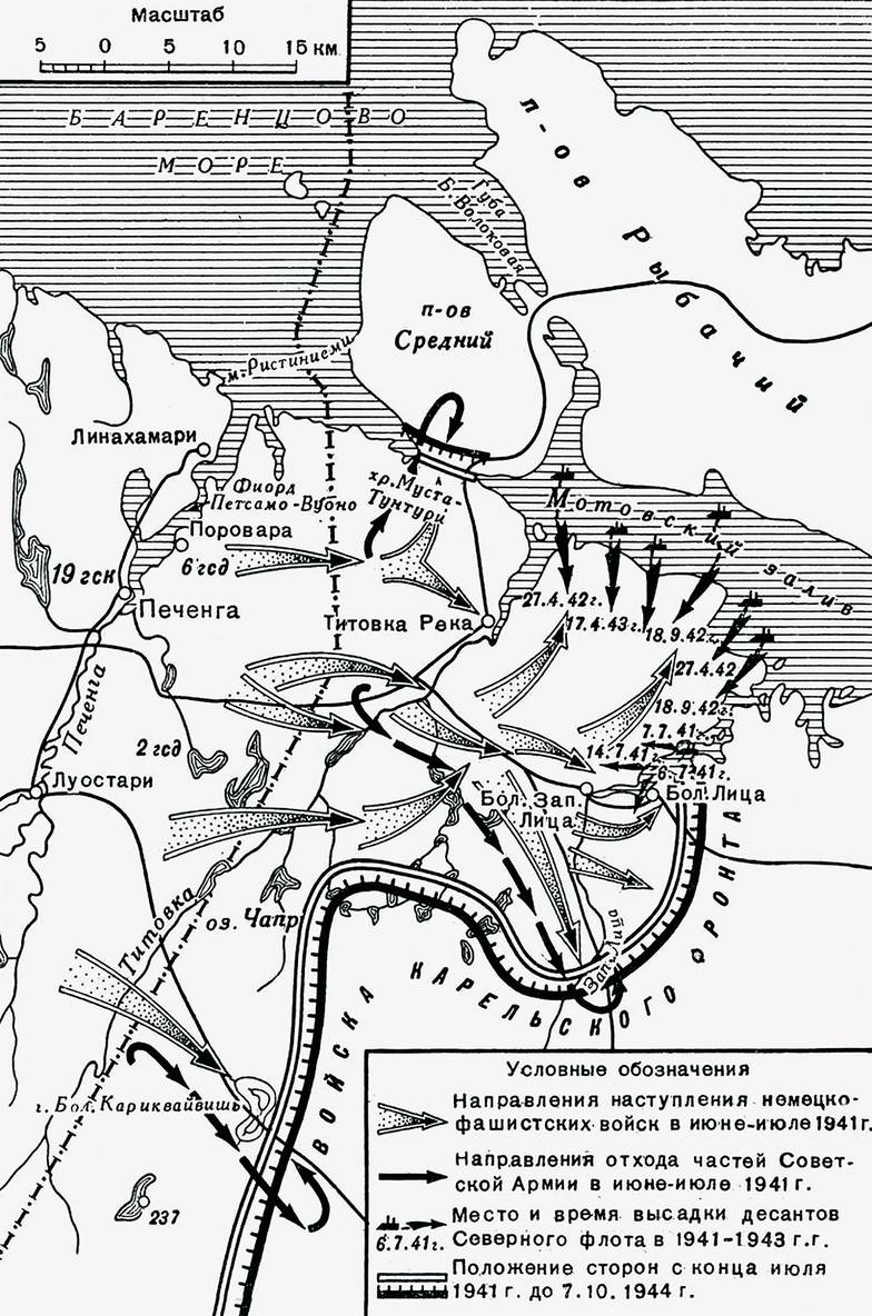 Двадцать второго июня 1941 года на всем отрезке границы от Баренцева до Черного моря протяженностью две с половиной тысячи километров лоб в лоб столкнулись две военные машины сильнейших на тот момент мировых держав. За первые полтора года войны Красной Армии пришлось отступать до Северного Кавказа и Сталинграда, отдав значительную часть промышленно развитой территории страны (8,7%) с населением 84,8 млн человек (44,5%). Однако на самом северном участке государственной границы, на полуостровах Среднем и Рыбачьем в Заполярье, в течение всей войны вермахту не удалось продвинуться на советскую территорию ни на метр.