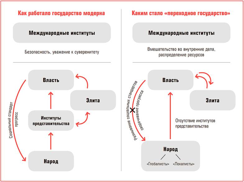 Если внутреннее устройство государства модерна было этакой четкой кристаллической структурой, то государство переходного периода такой структуры не имеет. Государство представляют личности и группы (собственно, как это и было при формировании концепций государства модерна), элиты эгоистичны и озабочены больше сохранением своего элитного статуса, чем процветанием государства, народ не имеет рабочих форм представительства, к тому же он теперь разделен не на классы по типу занятости (рабочие, крестьяне, буржуа), а по отношению к миру, к прогрессу — на людей мира (глобалистов) и людей, привязанных к своей земле (локалистов). Наконец, международные институты принципиально изменили свои цели: теперь их практики направлены на разрушение суверенитетов государств и на контроль над будущим и текущим распределением ресурсов Земли, которых явно будет не хватать.