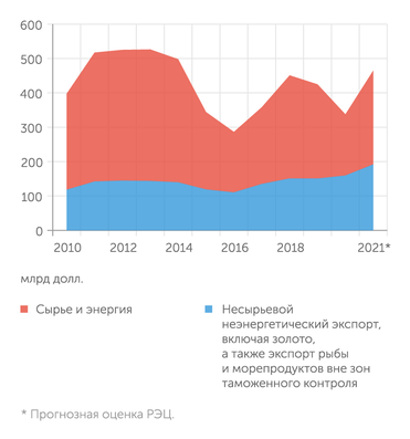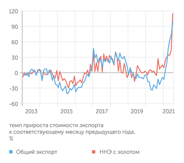 Конъюнктура начала осени свидетельствует о том, что по итогам всего 2021 года высокие приросты экспорта сохранятся. По оценке Российского экспортного центра (РЭЦ), общий экспорт вырастет как минимум на 35%, что позволит превысить уровень 2018 года (450 млрд долларов). ННЭ в классическом представлении может показать рост порядка 20% против прошлогоднего рекорда — примерно до 190 млрд долларов. В рамках же национального проекта «Международная кооперация и экспорт» несырьевой неэнергетический экспорт теперь считается, во-первых, без учета золота, и именно такие показатели теперь циркулируют в СМИ, а во-вторых, в ценах 2020 года, и здесь по итогам года реален рост порядка 5–8%.
