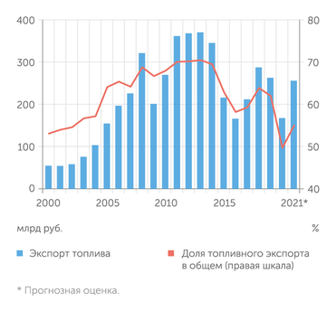 В том, что это произошло при гораздо более низких ценах на нефть, заслуга расширившегося несырьевого неэнергетического экспорта (ННЭ), который летом 2014-го составлял 12 млрд долларов в месяц, а сейчас почти в полтора раза больше (17 млрд). С сентября 2020 года ННЭ непрерывно обновляет рекорды соответствующих месяцев. В результате доля сырья и топлива в российском экспорте остается на многолетних минимумах. Так, за первое полугодие 2021 года на сырьевые товары пришелся 41% экспорта против 49% за аналогичный период 2019-го и 50–55% в первой половине 2010-х. Доля топлива (как первичного, так и переработанного) за этот же период составила менее 54%, последний раз она была такой в начале 2000-х.