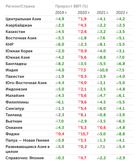 Согласно прогнозным оценкам АБР, экономический рост в регионе по итогам текущего года составит 7,1%. Это на 0,2 процентного пункта ниже, чем в апрельском варианте прогноза. В то время как прогнозы роста для субрегионов Восточной Азии и Центральной Азии повышены, пересмотр в сторону понижения для остальной части региона влияет на перспективы. Восстановление мирового спроса на экспорт, поддерживаемое устойчивым ростом в странах с развитой экономикой, будет и впредь приносить пользу странам региона, ориентированным на экспорт. Но темпы восстановления ослабли в экономиках, борющихся с новыми волнами COVID-19.