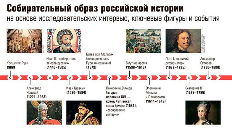«Первое — это круг событий, связанных с Иваном Третьим, собственно, с образованием России как государства, то есть многонациональной большой структуры, присоединение Новгорода, избавление от ига. Второе событие — это семнадцатый век, освоение Сибири. То, что нас сделало империей. Это время, когда многие крупные державы создавали свои империи, причем создавали их горизонтально. Но получилось так, что из всех этих горизонтальных историй удержали свою империю только мы. А удержали мы ее потому, что мы ее неразрывно привязали к себе, сказав, что это не колония, это — мы. И третье — это, наверное, Великая Отечественная и победа в ней. То, что сделало страну сверхдержавой».