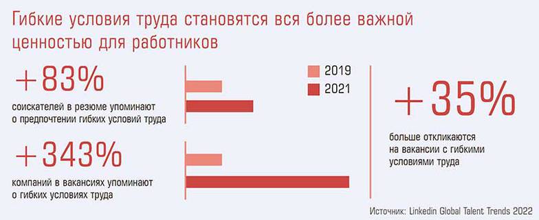 Более того, гибкие условия работы стали одним из самых популярных требований кандидатов, особенно среди молодых поколений. LinkedIn выяснил, что упоминание гибкого графика в посте повышает вовлеченность на 35%. А значит, упрощает наем.