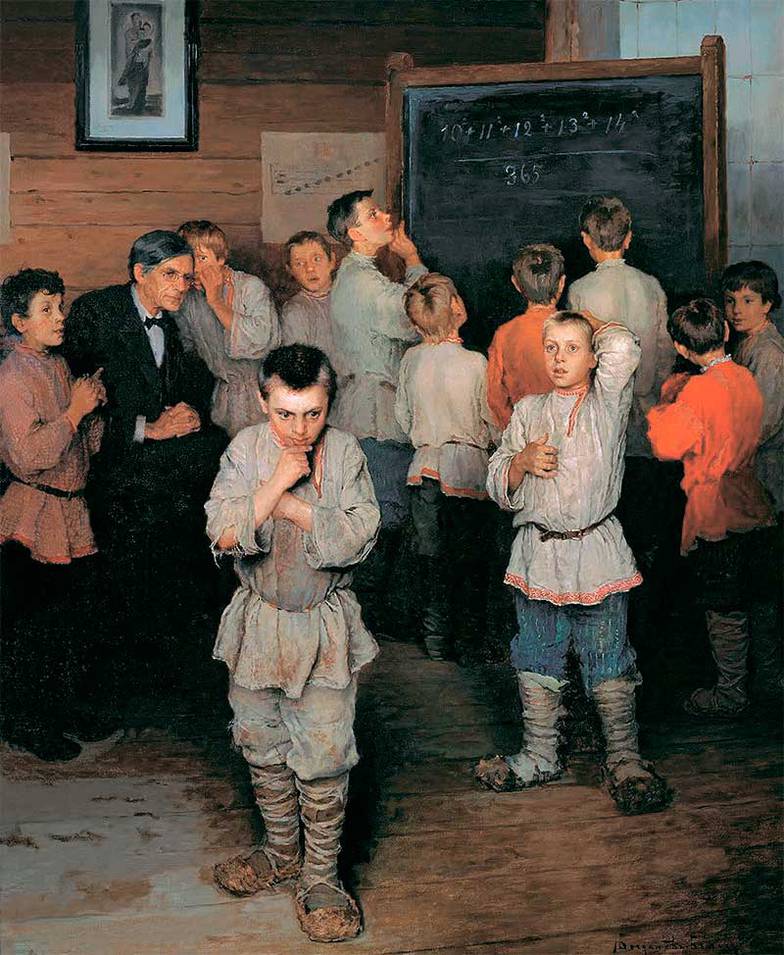 На картине «Устный счет. В народной школе С. А Рачинского» Николая Богданова-Бельского изображена школа для крестьянских детей в селе Татево Смоленской губернии (сегодня Тверская область), в которой учился и сам будущий художник. Основатель школы Сергей Александрович Рачинский, дворянин, ученый, заведующий кафедрой физиологии растений Московского университета, в 1867 году вышел в отставку, а в 1872 году приехал в родовое поместье и начал помогать своей сестре Варваре Александровне проводить занятия в крестьянской школе. Вскоре он основал свою школу-интернат, в которой преподавал четверть века. В 1870‒1880-е годы школа была четырехгодичная, а с 1898 года — шестилетняя.