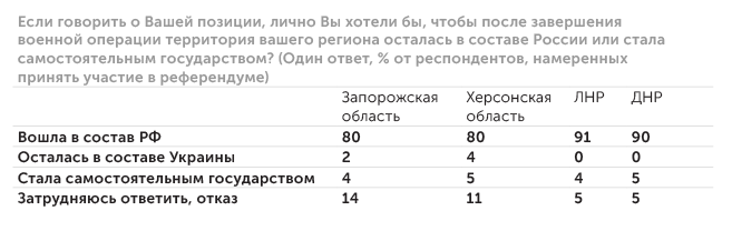 За присоединение к России готовы проголосовать 80% намеренных принять участие в референдуме жителей Запорожской и Херсонской областей, 91% — в Донецкой Народной Республике и 90% в Луганской Народной Республике.