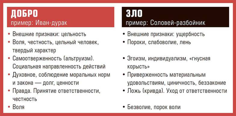 Положительный герой чтит законы и устои, совершает подвиги, аскетичен, помогает людям, рискуя жизнью и отказывая себе в чем-либо. Отрицательный герой, наоборот, нарушает закон, традиции, творит беззакония, ленив, порочен и безумно корыстен. Если выйти на более высокий уровень обобщения, мы увидим, что добрый герой самоотвержен (альтруист) и деятелен. И наоборот: злой герой корыстен и ленив. Несмотря на разнородность качеств, существует главный признак, который позволит различать «доброго молодца» и «антигероя» — это готовность и способность к напряжению усилий и преодолению трудностей. Мы увидим, что для доброго молодца самоотверженность, аскетичность и деятельность определены возможностью совершать «сверх-усилие» и наоборот: антигерою свойственны неготовность и невозможность напрягаться. Добрый молодец (волевой человек) часто готов на самопожертвование (пусть и «глупое», «не расчетливое»). Злодей всегда «разумно» своекорыстен и эгоистичен. Таким образом, воля — это альтруистичность, слабоволие — это эгоизм. Можно разделить понятия на две группы, которые объединяются в целостный образ двух систем (моделей):