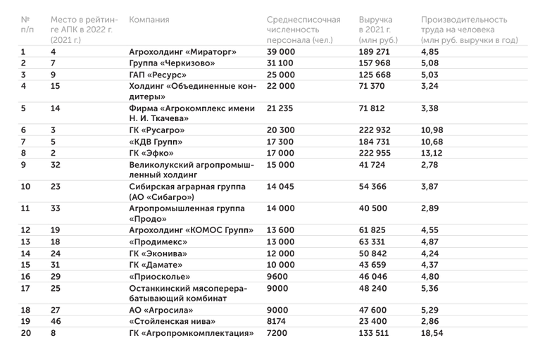 Участники рейтинга АПК — это крупный бизнес даже по мировым меркам. При среднем курсе доллара США, который в прошлом году составил 73,65 рубля, 19 млрд рублей — это 250 млн долларов, серьезная величина для агропрома. Получается, что за двадцать лет одна из самых проблемных сфер превратилась в драйвер развития страны, системообразующую отрасль, которая дает более четырех миллионов рабочих мест, обеспечивает рост ВВП и продовольственную безопасность России. Если в 2014 году «крымский» пакет санкций и контрсанкций вверг отечественного потребителя в шоковое состояние, то гораздо более мощные санкции 2022 года на продовольственном рынке практически не сказались.