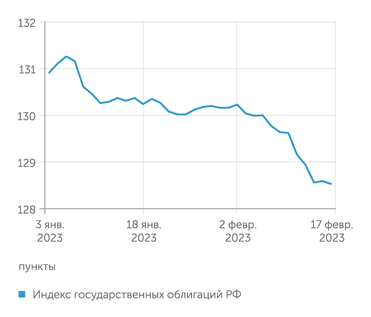 Негативные тенденции на рынке ОФЗ усилились в феврале: кривая облигаций с погашением после 2029 года ушла выше 10% годовых, а доходность самых длинных выпусков с погашением в 2035–2041 годах достигла 10,7% годовых. Годовые ОФЗ предлагают ставку 7,93% (рост на 49 б. п.), трехлетние — 8,88% (+48 б. п.), пятилетние — 9,71% (+58 б. п.), семилетние — 10,27% (+32 б. п.). На доходность ОФЗ влияет неопределенность ситуации с размерами государственного долга в 2023 году на фоне снижения доходов бюджета быстрее прогнозов.