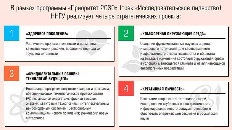 Третий проект нашей программы развития в рамках «Приоритета 2030» — «Фундаментальные основы технологий будущего». Если обобщить, то он направлен на формирование заделов для опережающего технологического развития нашей страны. Это совершенствование гиротронов*, это новые виды космической связи и лазерные системы, это возможности искусственного интеллекта, это развитие мемристоров и вычислительных систем на их основе. Стратегический проект реализуется большим числом наших подразделений, в их числе физический, радиофизический и химический факультеты, Институт информационных технологий, математики и механики (ИИТММ), Научно-исследовательский физико-технический институт (НИФТИ), НИИ химии, НИИ механики, НИИ нейронаук и другие.