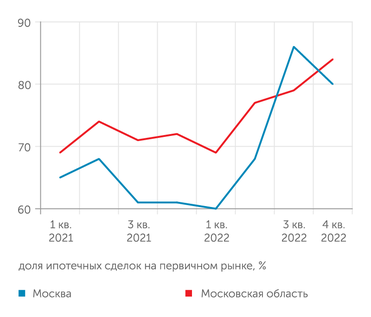 В конце прошлого года интерес россиян ко всем видам льготной ипотеки, и особенно к программе «Господдержка», подстегнула возможная перспектива закрытия льготной программы 31 декабря 2022 года. постановление правительства о ее продлении и изменении условий было опубликовано 29 декабря 2022 года. Всего на первичном рынке за счет ипотеки совершается более 80% сделок — такова ситуация в Москве и области.