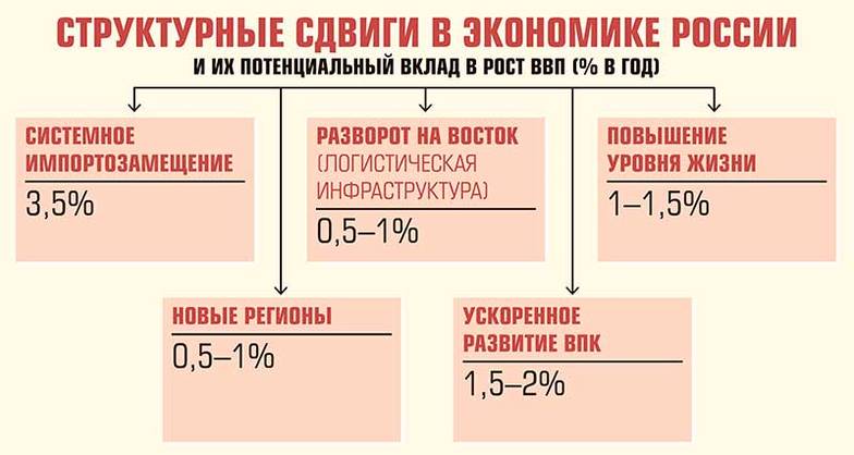 Влияние четвертого элемента структурного сдвига — эффект присоединения новых регионов — Марат Узяков (см. «Императивный прогноз: год 2023-й») оценивает в 0,5‒1% темпов роста ВВП в год, а мобилизационный потенциал сектора ВПК еще в 1,5‒2% роста ВВП.