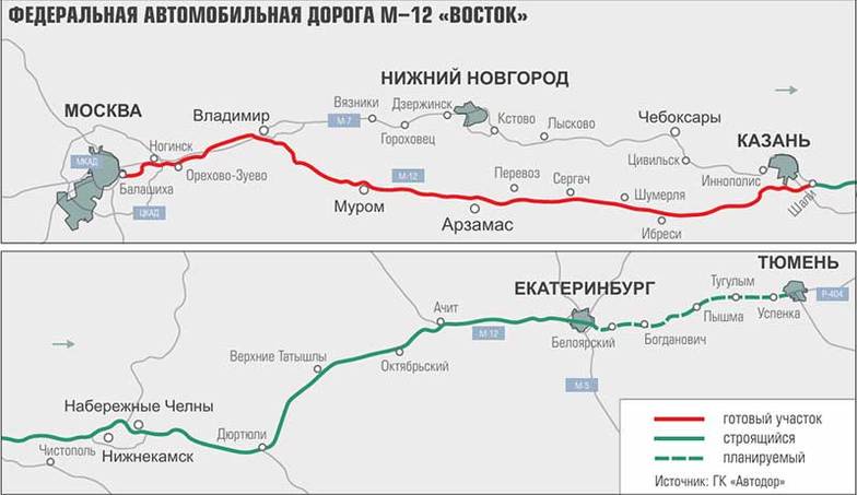 Во-первых, продолжение работ по М-12 «Восток» (с продлением до Тюмени). Трасса войдет в состав будущего сквозного маршрута протяженностью 12 тыс. километров от Санкт-Петербурга до Владивостока. М–12 начали строить в начале 2021 года. В конце 2023-го был сдан участок Москва — Казань, а до конца 2024-го планируется сдать участок до Екатеринбурга. Движение до Тюмени планируется открыть в 2025 году.