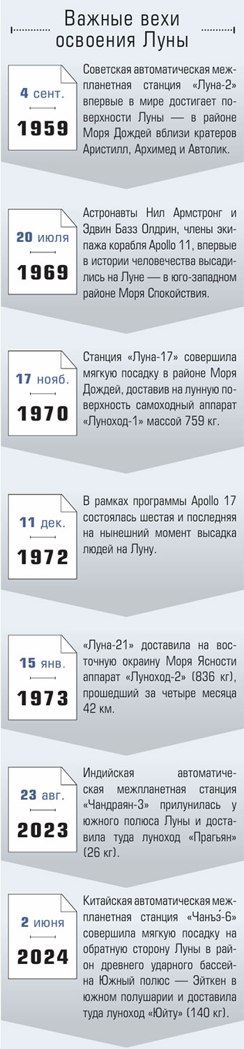 Этим летом стало известно, что Совет РАН по космосу разрабатывает программу научного освоения Луны до 2060 года. «В соответствии с текущими планами орбитальную станцию “Луна-26” запустят в 2028 году. Ее главная задача — выбрать подходящие посадочные площадки. Затем, в 2029 и 2030 годах, на южный и северный полюсы спутника будут направлены посадочные модули “Луна-27.1” и “Луна-27.2”. Еще через три-четыре года состоится миссия “Луна-28”, которая доставит на Землю образцы реголита. Предполагается также запустить орбитальную станцию “Луна-29”; помимо исследований, она будет выполнять функции ретранслятора. В 2035–2036 годах к спутнику отправят “Луну-30” с тяжелым луноходом для длительных научных изысканий», — сообщает президент РАН Геннадий Красников.