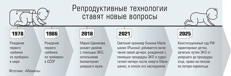 Знаковым в этом плане стало дело петербурженки Марии Щаниковой. Мария и Антон долго не могли завести ребенка и решили воспользоваться процедурой ЭКО. В 2016 году Антон заморозил свои биоматериалы и подписал договор, позволяющий Марии использовать их в случае, если с ним что-нибудь случится. Через некоторое время Антон скоропостижно скончался. Мария использовала биоматериал для ЭКО, и в 2018 году у нее родились близнецы. Суд признал отцовство, но Пенсионный фонд отказал в выплате детям пенсии по потере кормильцам. Аргументы фонда — дети были зачаты и родились, когда отца не было в живых, значит, они не находились на его иждивении. Суд Марии отказал. Мария дошла до Верховного суда, но все инстанции поддержали решение первой инстанции. Тогда Мария обратилась в Конституционный суд с тем, что ее детей лишают социального обеспечения. И уже Конституционный суд встал за защиту права детей, рожденных спустя почти два года после смерти их отца, на пенсию по потере кормильца. Суд указал, что постмортальные дети располагают конституционными правами (в том числе правом на социальное обеспечение, закрепленным статьей 39 Конституции РФ), а значит, не могут быть ограничены в правах без прямого указания федерального закона.