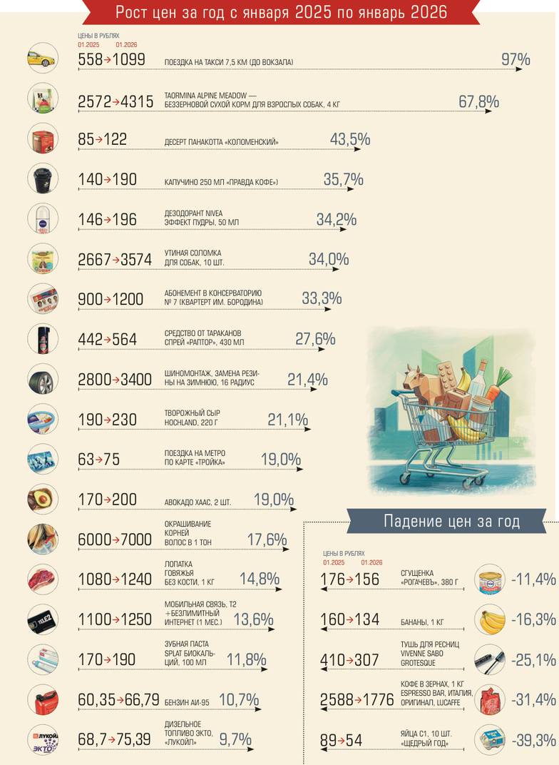 Но, разумеется, гораздо больше товаров и услуг за последние 12 месяцев серьезно прибавили в цене. По нашим данным, абсолютный рекордсмен — такси: с про шлого января поездка протяженностью 7,5 км из отдаленного микрорайона до железнодорожной станции одного из подмосковных городов в 7:00—7:30 утра подорожала почти вдвое, на 97%, — с 558 до 1099 рублей. На втором месте сухой корм для собак Taormina Alpine Meadow: упаковка весом 4 кг подорожала на 68%, с 2572 до 4315 рублей (мы фиксируем цены на Ozon, выбирая минимальную без Ozon-карты). Замыкает тройку ли деров десерт панакота «Коломенский», цена на который выросла на 43%, с 85 до 122 рублей. В числе быстро дорожавших товаров также капучино навынос, абонемент в консерваторию, проезд по карте «Тройка» в московском метро. Ин тересно, что бензин Аи-95 и дизельное топливо ЭКТО от «ЛУКойла» находятся в хвосте списка подорожавших — с про шлого января они прибавили лишь 10,7 и 9,7% соответственно.